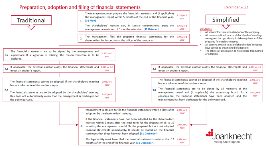 In this context it is important to emphasize that the law makes a distinction between the preparation and making available for inspection of the financial statements (this must be done within 5 months) and the signing of the financial statements (for which the law does not specify a term). Although it is obvious that the moment of signing will not be long after the preparation, it is also logical that this moment is not the same as the moment of preparation. After all, if those moments were to coincide, then other persons entitled to attend the meeting would not have the opportunity to take cognizance of the prepared annual accounts before agreeing to the abridged adoption procedure. In addition, in the case of a (medium) large company, shareholders would not have the opportunity to take note of the auditor’s report.